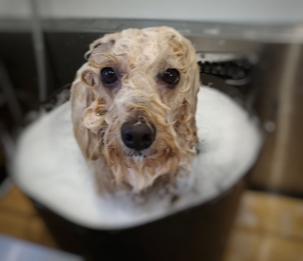 そして今回はお肌の事を考えて、セラミド入りの泡パックシャンプーを試してみました。その後の温浴は初めてでしたが大人しくしていましたよ😊