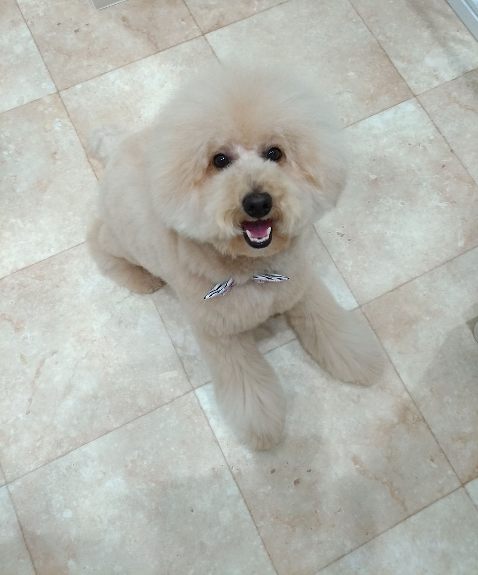 カット内容はむっくちゃんのお家のお姉ちゃん達のご希望で、ボカボサに見えるスタイル、というオーダーをいただきました。足などの毛玉の出来やすさなども考えて、バランスを取りながら胴体の毛もカット。足や体もなるべく切った感じがでないように、スキバサミをかなり活用してトリミングしました。プードルやその他の犬種のトリミングは面をきれいに揃えることが基本です。トリミングの専門学校ではボサボサスタイルを習っていなかったので😁とても斬新に感じました!こういうカットがあってもいいですね。