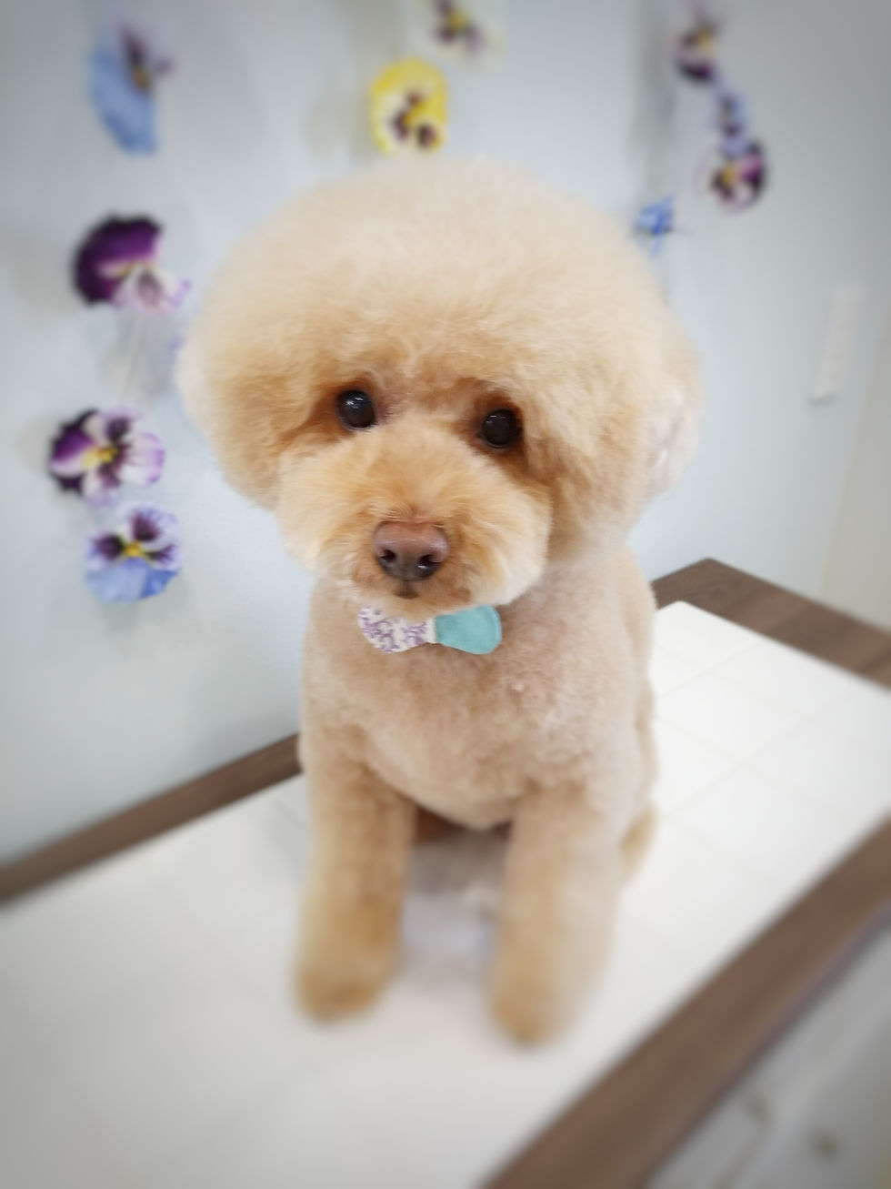 カット内容は体の毛の長さが1cmくらい、お顔がトレンドのアフロ、尻尾がポンポンのように丸く、です。