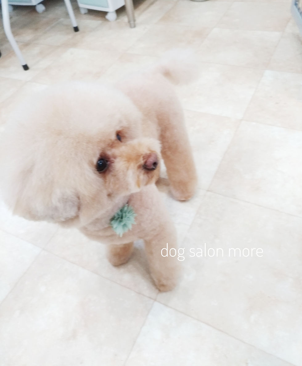 カット内容は体を10mm、尻尾をポンポンのように丸く、顔はトレンドのアフロカットです。今回もシャンプー中にはアロマ乳液風呂をかけ湯しまして、アルガンオイル、シアバター配合のトリートメントをして被毛に滑りを与えています。皮膚に赤みがあるレビンくんなので、ドライイング前には高濃度セラミドのスプレーをかけて保湿もしました!前回もスプレーをしていて、少し改善しているようでしたのでレビンくんは乾燥肌なのかもしれませんね~。トリミングの合間の休憩ではママが持参してくれていたおやつをあげましたが、なかなか食べず…でしたがトリミング後に美味しそうに食べてくれましたよ😊休憩からトリミングを再開する時においで~と言うと尻尾を振ってこちらに来てくれたレビンくん♡少しずつ慣れてきてくれているようで安心しました!