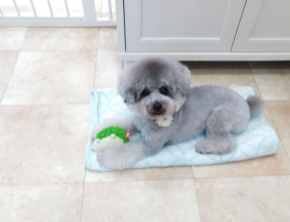 今日はトリートメント後の温浴は座ってくれて気持ちよさそうにしていましたよ~✨😆むっくくん、耳の所の赤みがあるのでシャンプーでキレイにしたあとはセラミドのスプレーを付けて保湿しました!カットが終わった後はおもちゃで楽しそうに遊んでお迎えを待っていましたよ~🌸