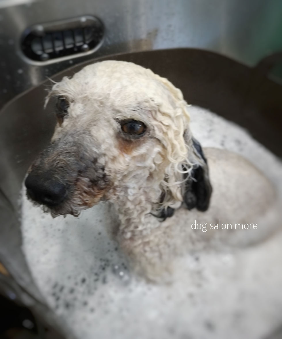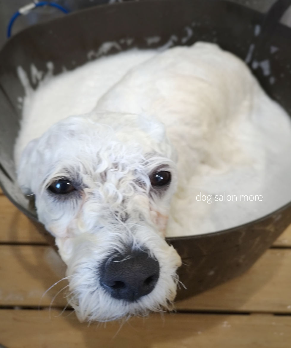 今回もいつも通りじろくんからのシャンプー前の準備を始めました!じろくん、背中の毛を伸ばしているので毛は10cm以上の長さがあり、そして毛量がかなりあるのですが、ママのお手入れが素晴らしいので毎回ブラッシングする度にママすごい!って思いながら作業しています。そしてじろちゃんもブラッシングに時間がかかるのにトリミングテーブルの上で大人しくフセをしてくれているのです😊さぶろちゃんはというと…最初の爪切りはトリミングテーブルの上に立っていてくれます(笑)あとは横になってしまうので、寝たままブラッシング、足の裏のカット等行いましたよー。保湿泡パックシャンプーの後に温浴。夏場なので温浴温度も低めにしています。その後はふたりともいつも通りトリートメントを行いました!ドライイング前にもトリートメントミストをして、サラサラ増々で~す😆ドライイング後も入念に冷風を掛けながらコーミングを行いましたよ✨